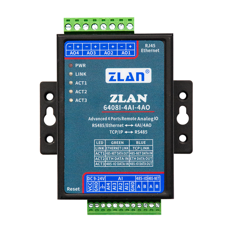 4路产品包含有4路DI、4路DO、2路AI。2路,AI可以为4~20mA的电流量或者0~5V、0~10V(可选)的电压量。8路产品包含有8路数字量输入、8路继电器输出、8路模拟量输入,前4路AI为0~5V电压量输入,后4路AI为4~20mA电流量采集。