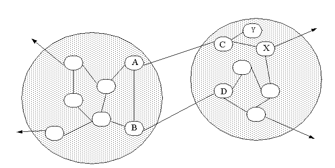 Assume that two autonomous networks are connected to each other at two locations, as shown in Figure 5.3, with connections to different autonomous networks at other locations. The A–C connection and the B–D connection can both be used for routing from within the networks, depending on which is the optimal path. Gateway C has a copy of gateway A's routing table, and vice versa. Gateways B and D each have copies of the other's routing tables, as well. These copies are transmitted at intervals so the gateways can maintain an up-to-date picture of the connections available through the other gateway. The gateways use EGP to send the messages. (They would use GGP if they were core gateways.)