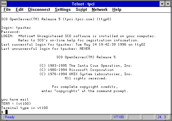telnet 205.150.89.1 Trying... Connected to tpci Escape character is '^]'. HP-UX tpci A.09.01 A 9000/720 (ttys2) login: tparker password: xxxxxxxx $