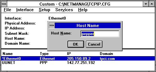 Most TCP/IP suites for other operating systems use a simpler method of setting the host name. For example, on a Windows 3.x machine the NetManage ChameleonNFS package uses the dialog shown in Figure 7.2 to quickly set the host name.