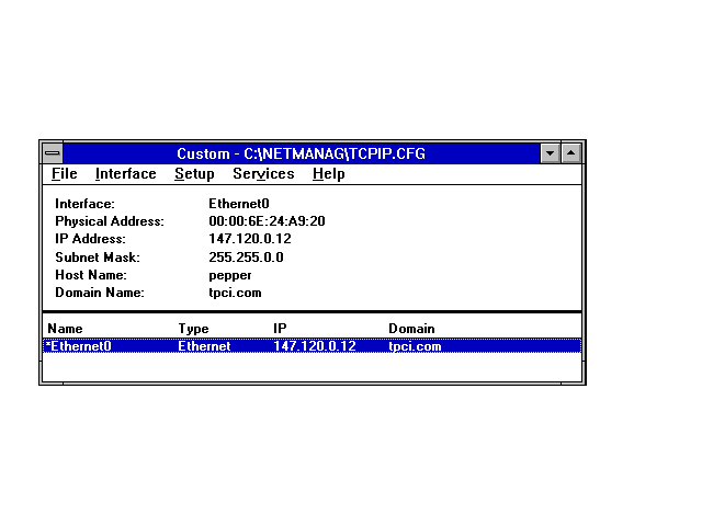 If the installation routine didn't add the machine's name and IP address to the Custom screen, use the Setup menu item to select the different aspects of the configuration that must be specified. You should provide a machine name, IP address, subnet mask, and domain name, as well as the interface if not already added (Ethernet, in this case).