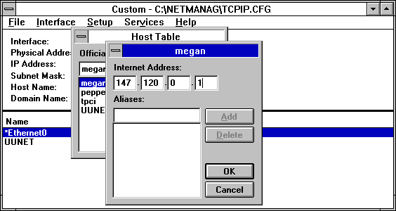 To enter the names of the other machines on the network and their IP addresses, select the Services menu Host Table option to display the Host Table dialog box. To add the other machines on the sample network, enter a name in the top portion of the window in the field titled Official Name and click the Add button. This shows a window for the IP address, which should be filled in completely. Then click OK. The IP address and the machine name are now entered into the host table. This window is shown in Figure 10.5 with the address for the machine merlin added. If a machine has more than one name, the different names can be added as aliases through this screen, as well.