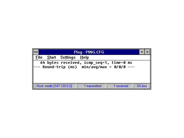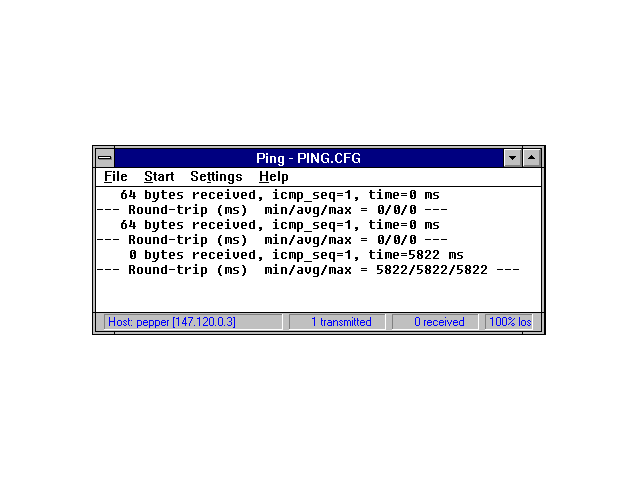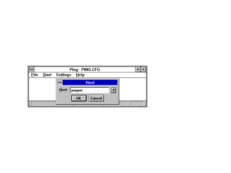The easiest way to test the new TCP/IP system is to use the ping utility within the Chameleon program group. When selected, it displays a small dialog box. Select the Start option, which displays another dialog box waiting for a machine name. Enter the name of the local machine. This is shown in Figure 10.6 for the sample network Windows machine pepper.