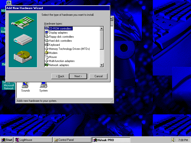 If Windows 95 didn't detect the network adapter, you have to install and configure it manually. Windows 95 shows a dialog like the one in Figure 10.9. Clicking the Next button displays the dialog shown in Figure 10.10, which asks for the type of new hardware device you are installing. In this case, you double-click the Network adapters option.
