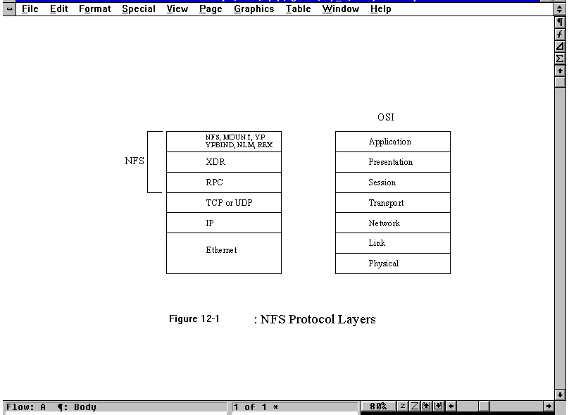 The NFS product comprises several protocols, only one of which is called the NFS protocol. The NFS product protocols are designed as a set of layers, similar to the OSI model. The layers of the NFS product are compared to the OSI layers in Figure 12.1. Each protocol in the NFS product has an Internet RFC dedicated to its specification.
