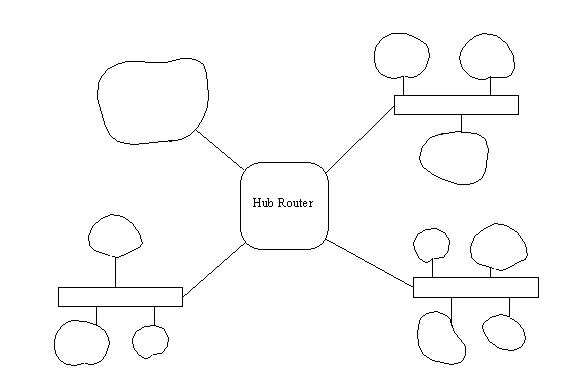 Routers, too, can be used to control large networks. This is an advantage when broadcasts are frequently used, because the router can filter out broadcasts that apply only to a specific LAN. (Most bridges propagate broadcasts across the network.) The use of a single switching router or hub router is becoming popular for joining different LANs within an organization, as shown as in Figure 13.5.